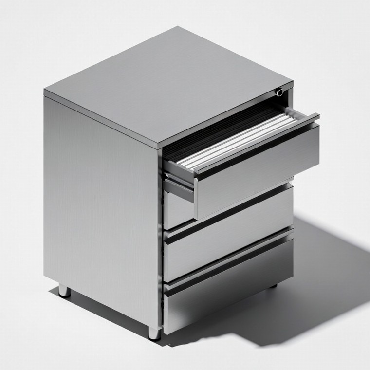 3D render, commercial storage, drawer unit, file cabinet, file folders, isolated background, metal cabinet, modern furniture, office furniture, open drawers, silver cabinet, storage drawers, swivel casters, vertical cabinet, stainless steel