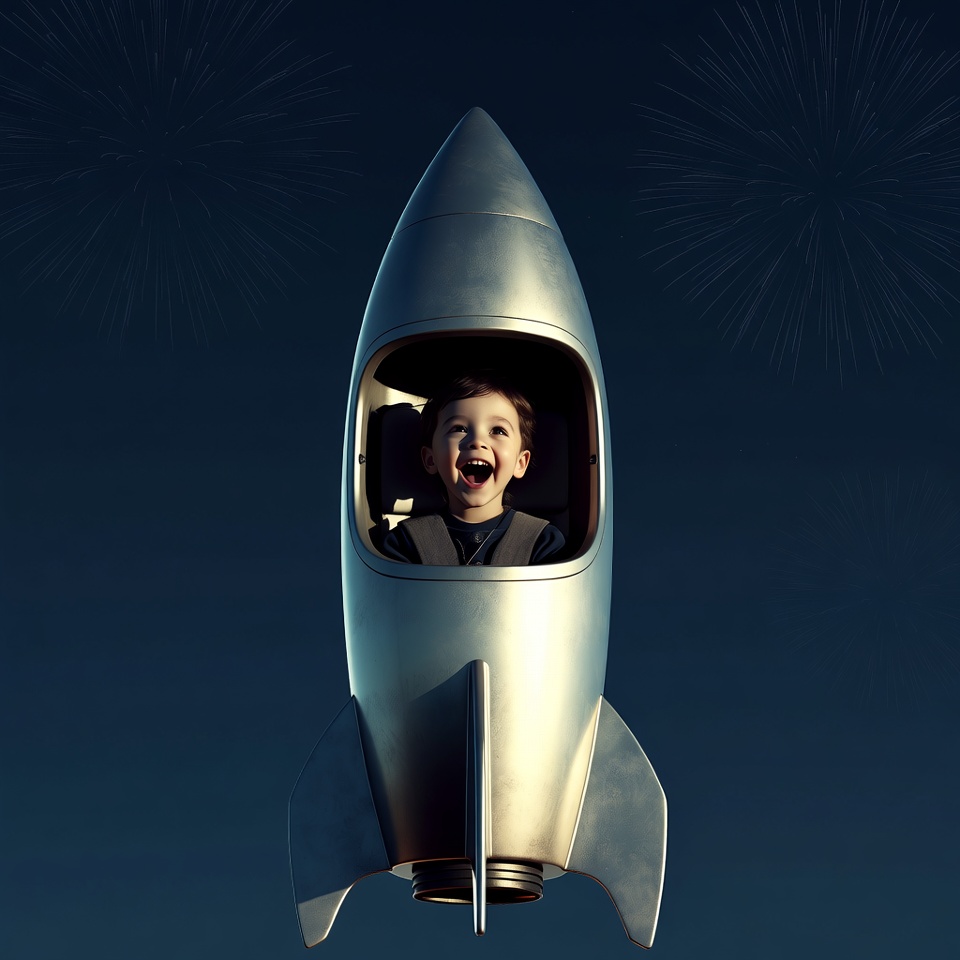 A young boy with brown hair sits excitedly in the open cockpit of a shiny silver rocket ship, smiling widely at the viewer. He wears a blue shirt and is buckled into a seat. Colorful fireworks explode in the dark blue night sky behind the upward-pointing rocket.