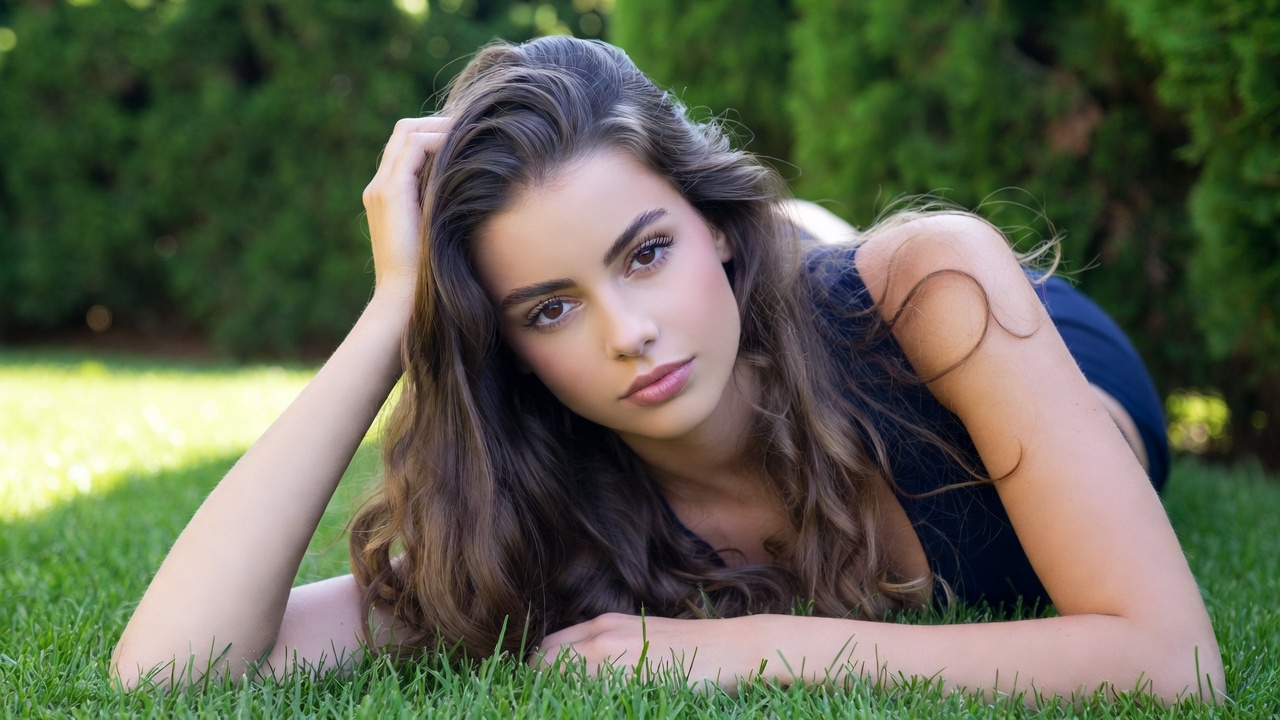A young woman with long wavy brown hair lies on her stomach on green grass in a sunny outdoor setting. She wears a dark sleeveless top and rests her head on one hand while gazing at the camera. Lush green bushes form the background behind her.