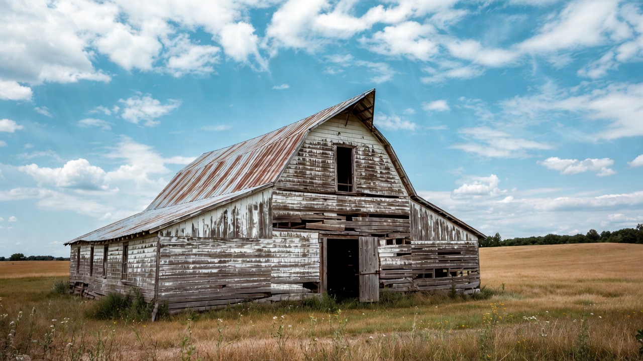abandoned barn, agriculture, barn exterior, blue sky, clouds, countryside, farm barn, farm building, farmland, field, gabled roof, golden grass, old barn, rural landscape, rusted roof, rustic barn, sky, tin roof, weathered barn, white barn, wooden barn, barn