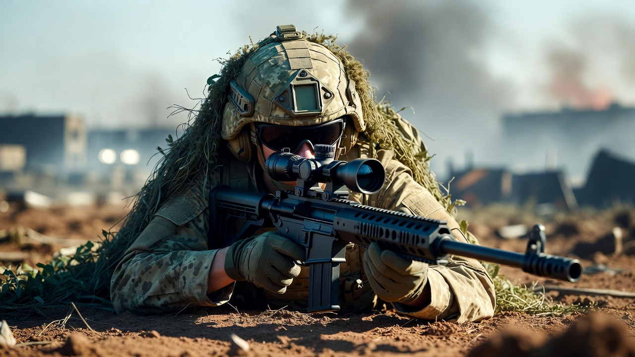A male soldier in camouflage gear and helmet lies prone on sandy terrain, aiming a rifle with scope through netted ghillie suit. He wears tactical gloves and goggles, focused on targets amid ruined buildings and smoke in the background. Explosions and debris create a battlefield setting.
