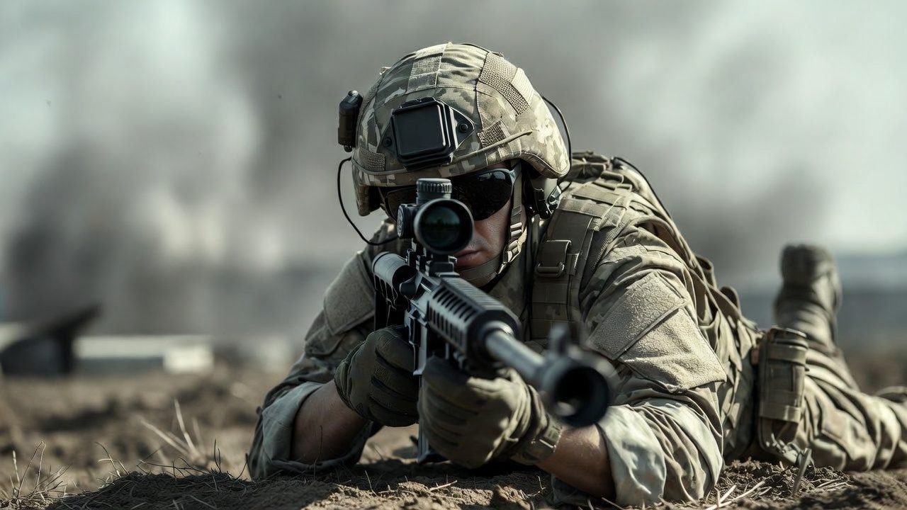 White, aiming rifle, army, battlefield, camouflage uniform, combat, desert terrain, gloves, goggles, ground, helmet, infantry, lying down, male, man, military, prone, prone position, rifle scope, scoped rifle, smoke, sunglasses, tactical gear, tactical helmet, war zone, weapon, soldier