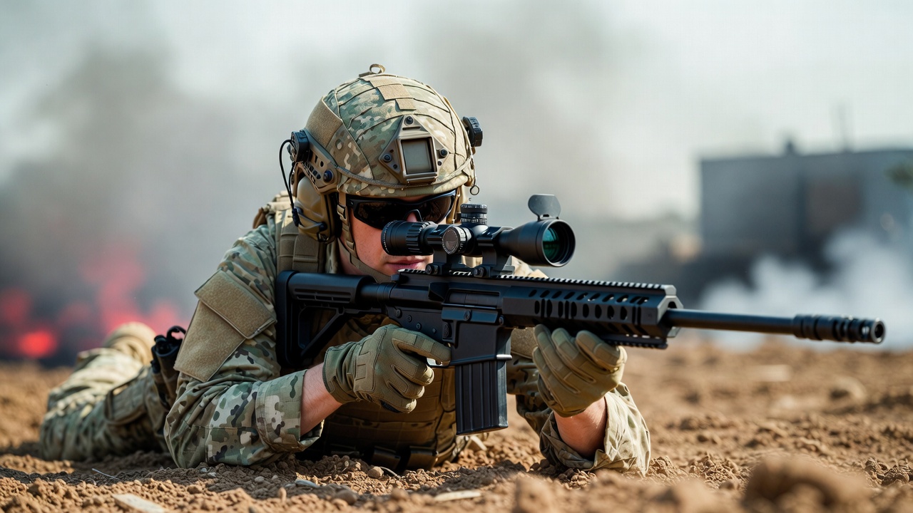 Soldier aiming sniper rifle prone