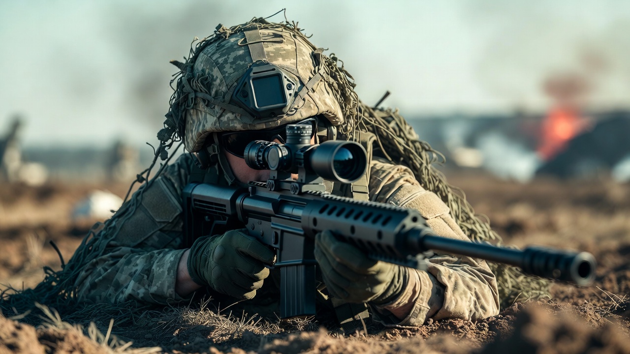 A male soldier in camouflage gear and helmet lies prone on the ground, aiming a sniper rifle with scope through tall grass. He wears gloves and tactical vest in a battlefield setting with smoke, fire, and distant figures in the blurred background. The rifle features a long barrel and suppressor.