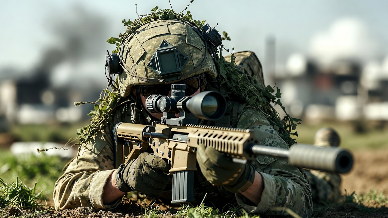 A male soldier in camouflage uniform and helmet with netting lies prone in grassy terrain, aiming a scoped AR-15 style rifle with suppressor. He wears tactical gloves and focuses through the scope amid blurred buildings and vegetation in the background. The scene depicts a military field position.