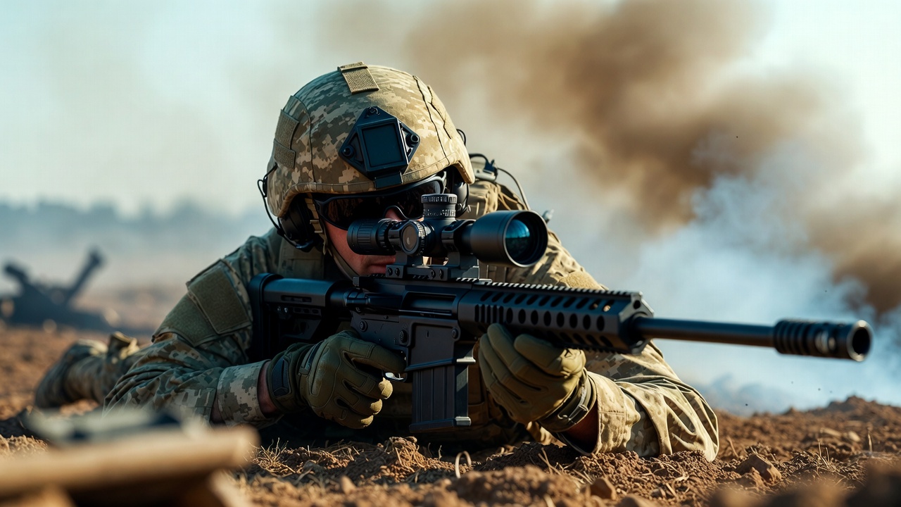 A soldier in camouflage uniform and helmet lies prone on dusty ground, aiming a black sniper rifle with scope. He wears tactical gloves and goggles, with smoke and battlefield debris in the blurred background. The rifle features a suppressor on the barrel.
