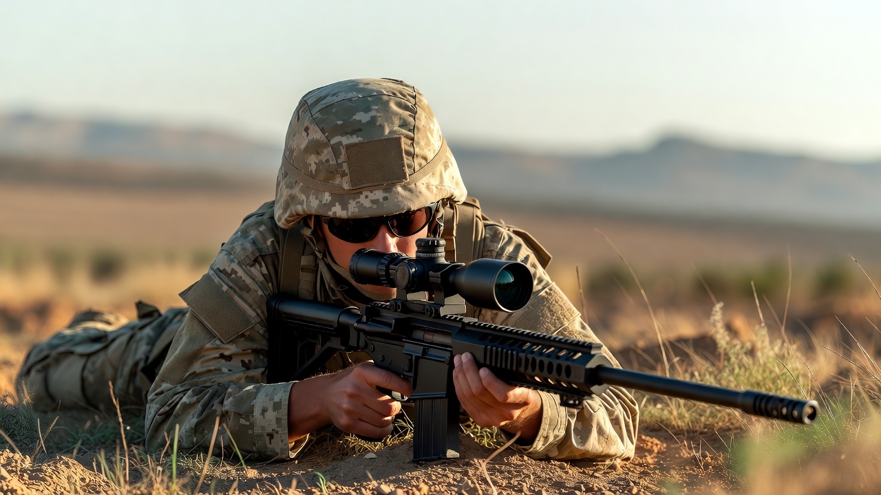 Soldier aiming sniper rifle prone