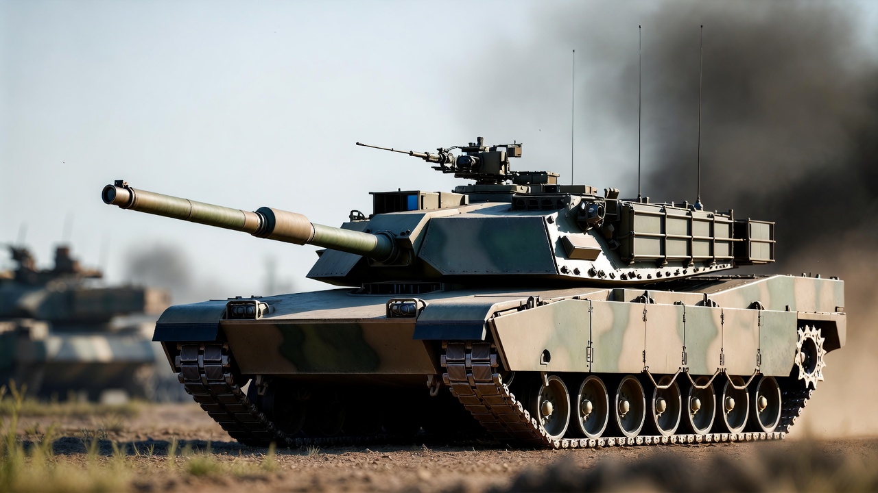 A camouflaged M1 Abrams main battle tank drives across a dusty desert terrain with grass. It features a long barrel gun, turret with antennas, and tracks kicking up dust. Additional tanks are visible in the blurred background.