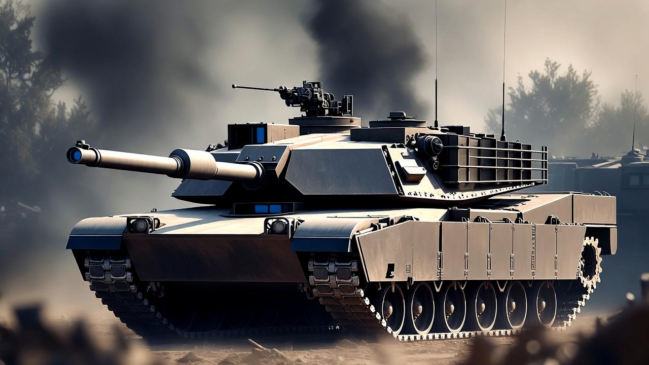 A detailed M1 Abrams main battle tank advances through a smoky battlefield with other tanks in the blurred background. The tank features a long barrel cannon, heavy armor plating, and tracks on rugged terrain. Smoke and dust surround the military vehicle under a hazy sky.
