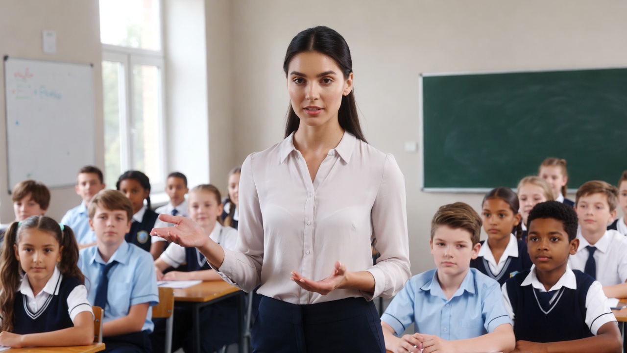 A female teacher with dark hair stands at the front of a classroom, gesturing with both hands while facing her students. The students, a diverse group of boys and girls in school uniforms, sit attentively at desks with notebooks. A large green chalkboard and windows are visible in the background.