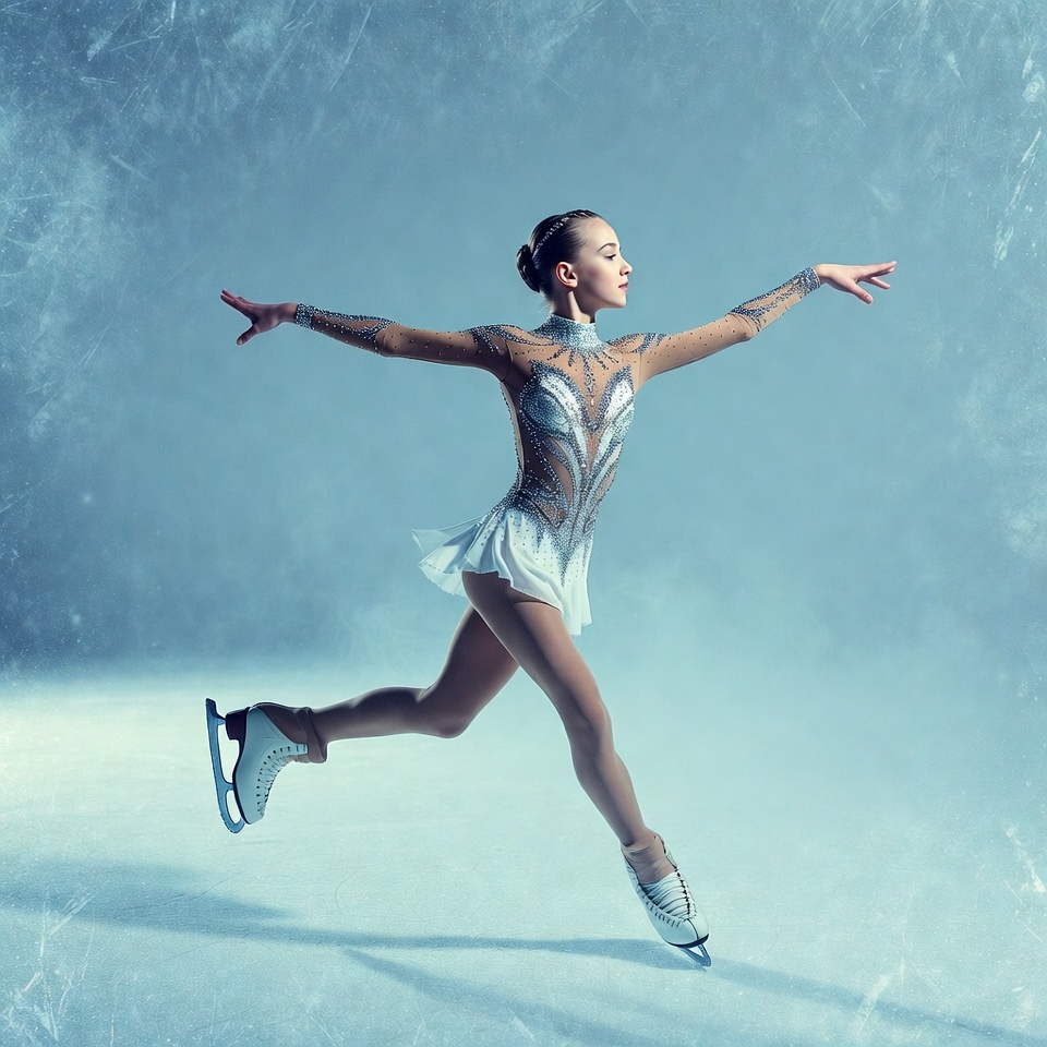 White, arms extended, bun hairstyle, dynamic movement, elegant, female skater, graceful pose, ice rink, ice skates, ice surface, legs extended, long sleeves, performance, sheer fabric, short skirt, skating dress, skating pose, snowy background, sparkly costume, sport, white outfit, winter sport, woman, young, figure skating