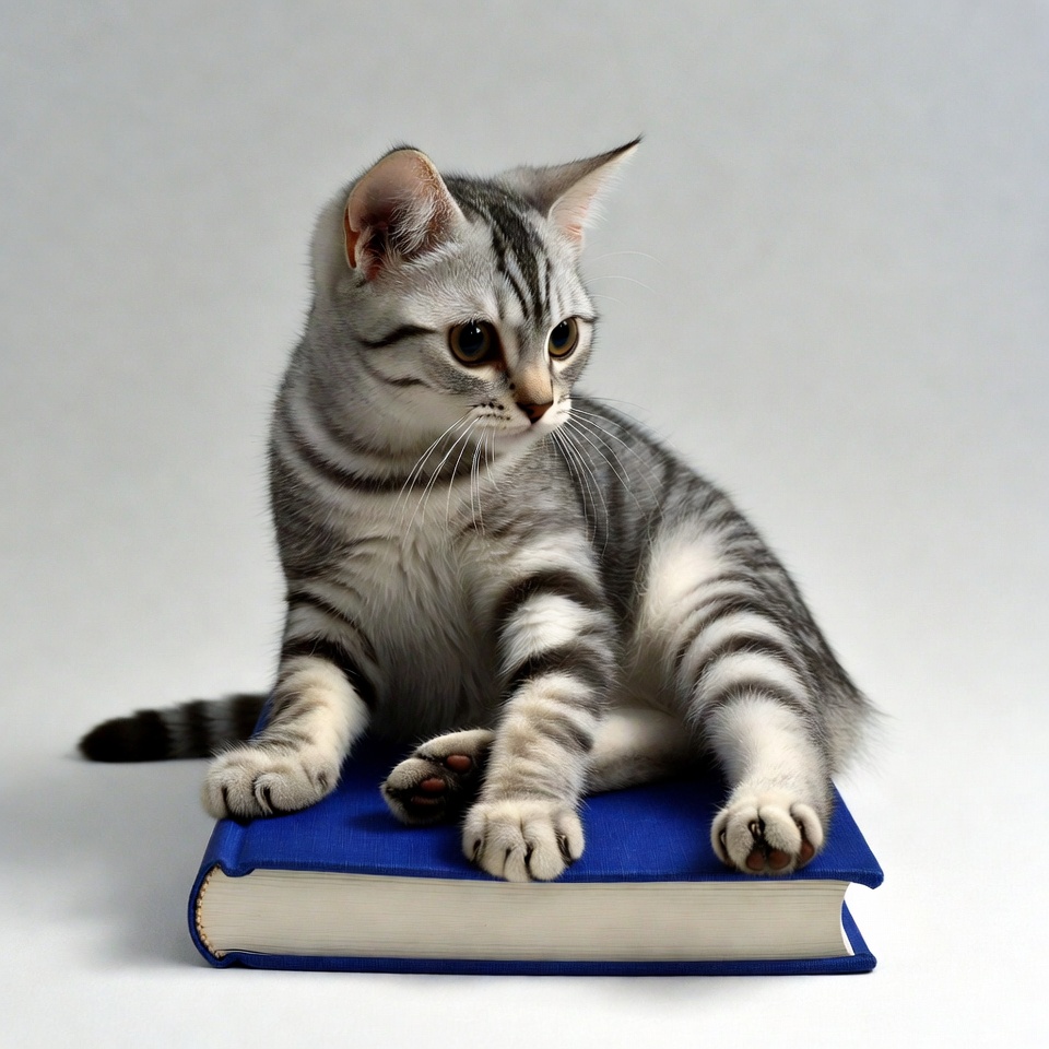 animal, blue book, book, cat, cute kitten, fluffy fur, gray tabby, green eyes, isolated background, paws, pet, sitting cat, striped cat, young cat, kitten