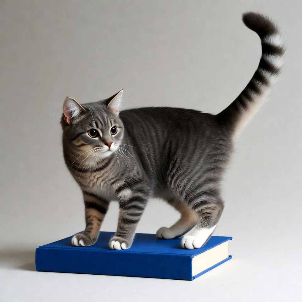 A young gray tabby cat with white paws stands on a large blue hardcover book. Its bushy striped tail is raised high behind it. The cat faces forward with green eyes on a plain white background.