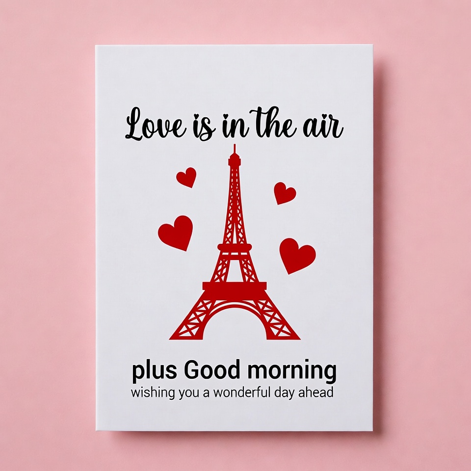 A Valentine's-themed greeting card features a red silhouette of the Eiffel Tower with floating red hearts around it. The text 'Love is in the air' appears above the tower, and below it reads 'plus Good morning wishing you a wonderful day ahead'. The card has a white background and is displayed against a soft pink surface.