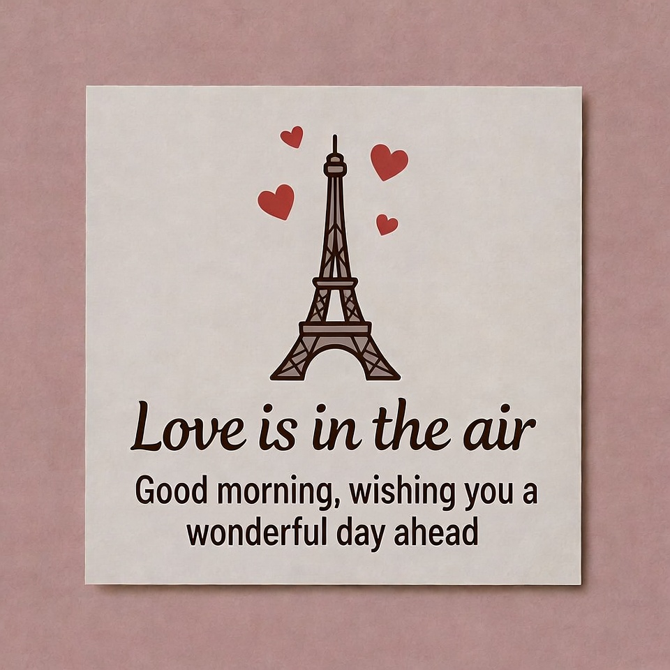 A greeting card illustration features a beige outline of the Eiffel Tower with floating red hearts around it. The text 'Love is in the air' appears above 'Good morning, wishing you a wonderful day ahead'. The card has a light pink background.