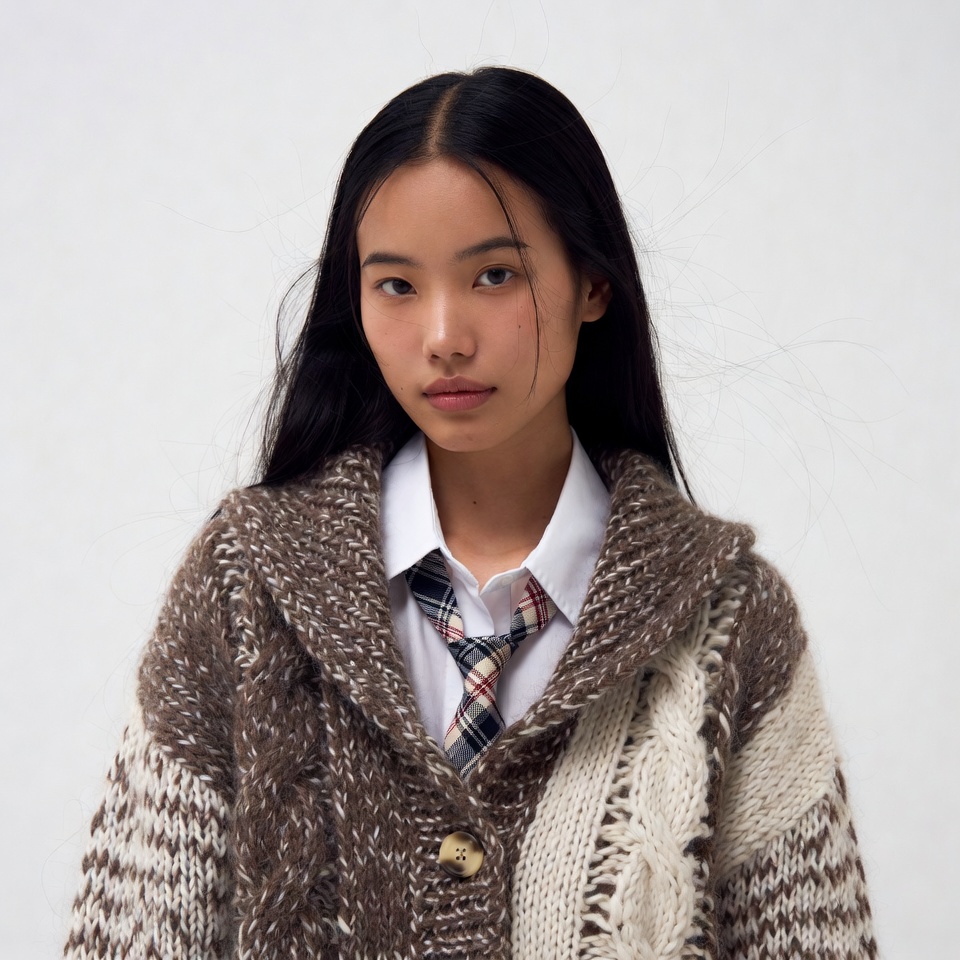 A young Asian girl with long straight black hair stands against a white background. She wears a white collared shirt with a plaid tie and a chunky knit cardigan in brown and white. Her expression is neutral with slightly parted lips.