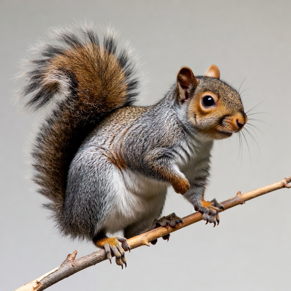 animal, brown accents, bushy tail, claws, cute squirrel, fluffy fur, gray squirrel, isolated background, large eyes, nature, paws, perched squirrel, small ears, wildlife, wooden branch, squirrel