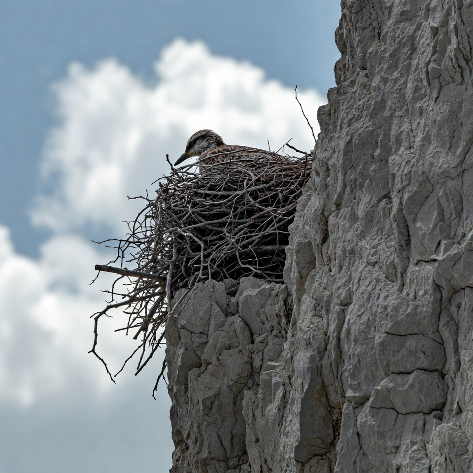 animal, blue sky, branches, brown bird, cliff, clouds, feathers, isolated background, nature, nest, outdoors, perched, rock, twigs, white rocks, wildlife, bird