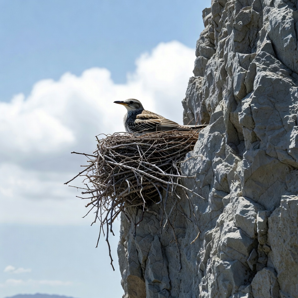 avian, bird nest, birdwatching, blue sky, cliff nest, mountain background, nature, nest, outdoor, perched bird, rocks, rocky cliff, streaked feathers, twigs, white clouds, wildlife, yellow beak, bird