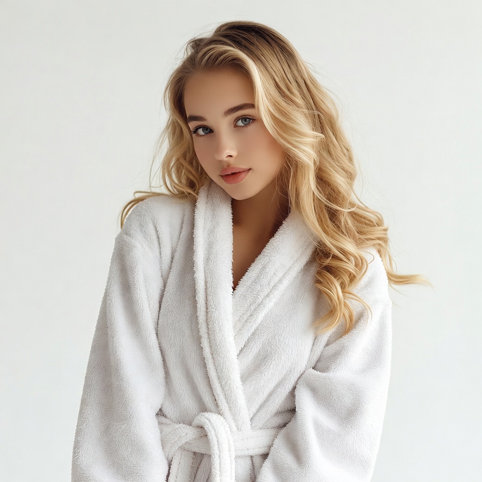 A young woman with long wavy blonde hair stands wearing a fluffy white bathrobe. She gazes slightly to the side with a subtle expression on a plain white background. The bathrobe is tied at the waist with long sleeves.