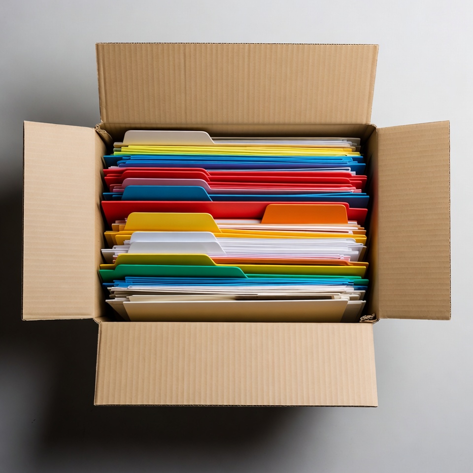 A top-down view shows a brown cardboard box filled with stacked manila folders in vibrant colors including red, yellow, blue, green, and white. The box is open with flaps folded back, placed on a plain gray background. The folders are neatly organized and overflowing slightly from the box.