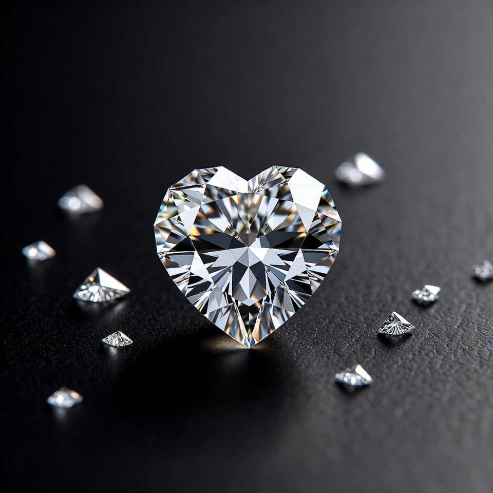 A large heart-shaped diamond gemstone sits prominently on a glossy black surface. Surrounding it are numerous smaller diamond fragments and shards scattered around. The diamonds sparkle with brilliant facets against the dark backdrop.