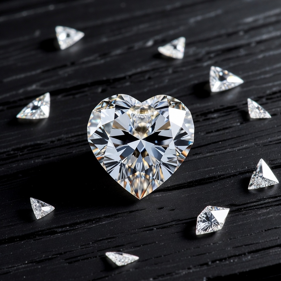 A large heart-shaped diamond sits prominently on a black wooden surface. It is surrounded by numerous smaller trilliant-cut diamonds scattered around it. The diamonds sparkle with facets catching the light against the dark background.