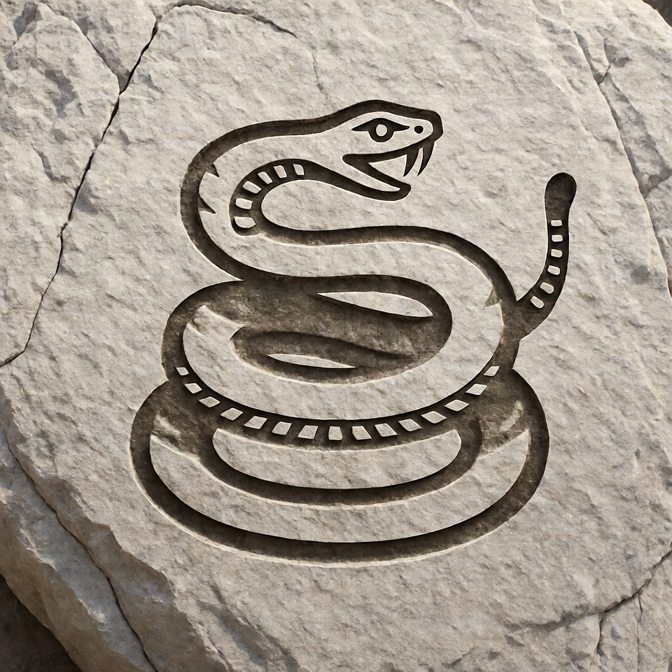 A coiled snake with an open mouth is intricately carved into a light gray rock surface. The engraving features detailed scales and a striking pose. The snake appears aggressive with visible fangs.