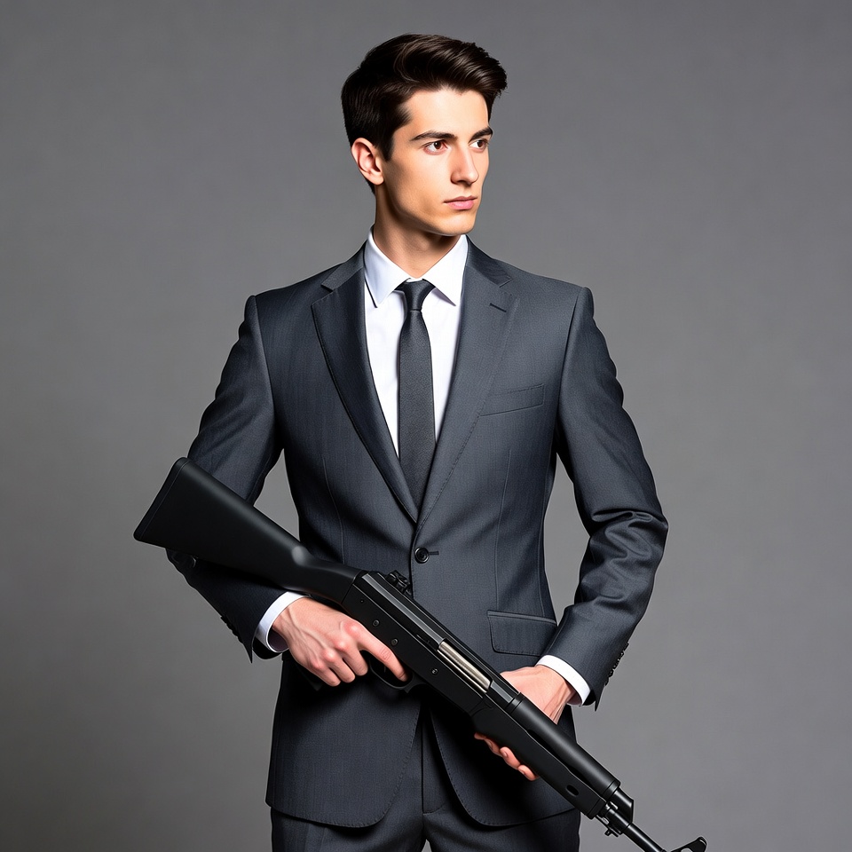 A young man with short dark hair stands confidently against a gray background, dressed in a gray suit, white shirt, and black tie. He holds a black assault rifle with both hands across his body. His expression is neutral as he gazes slightly to the side.