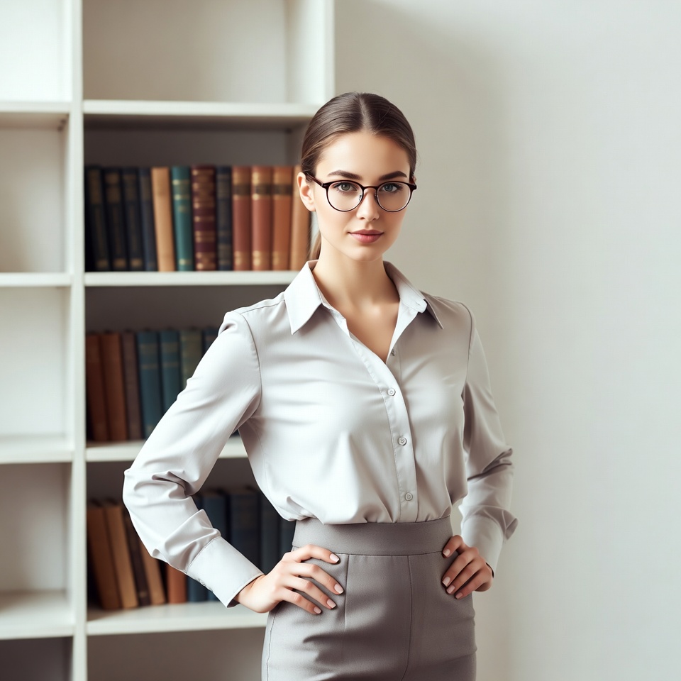 White, books, bookshelves, brunette hair, confident woman, female, glasses, gray blouse, gray skirt, hands on hips, library, office, ponytail, professional attire, standing pose, young woman, woman