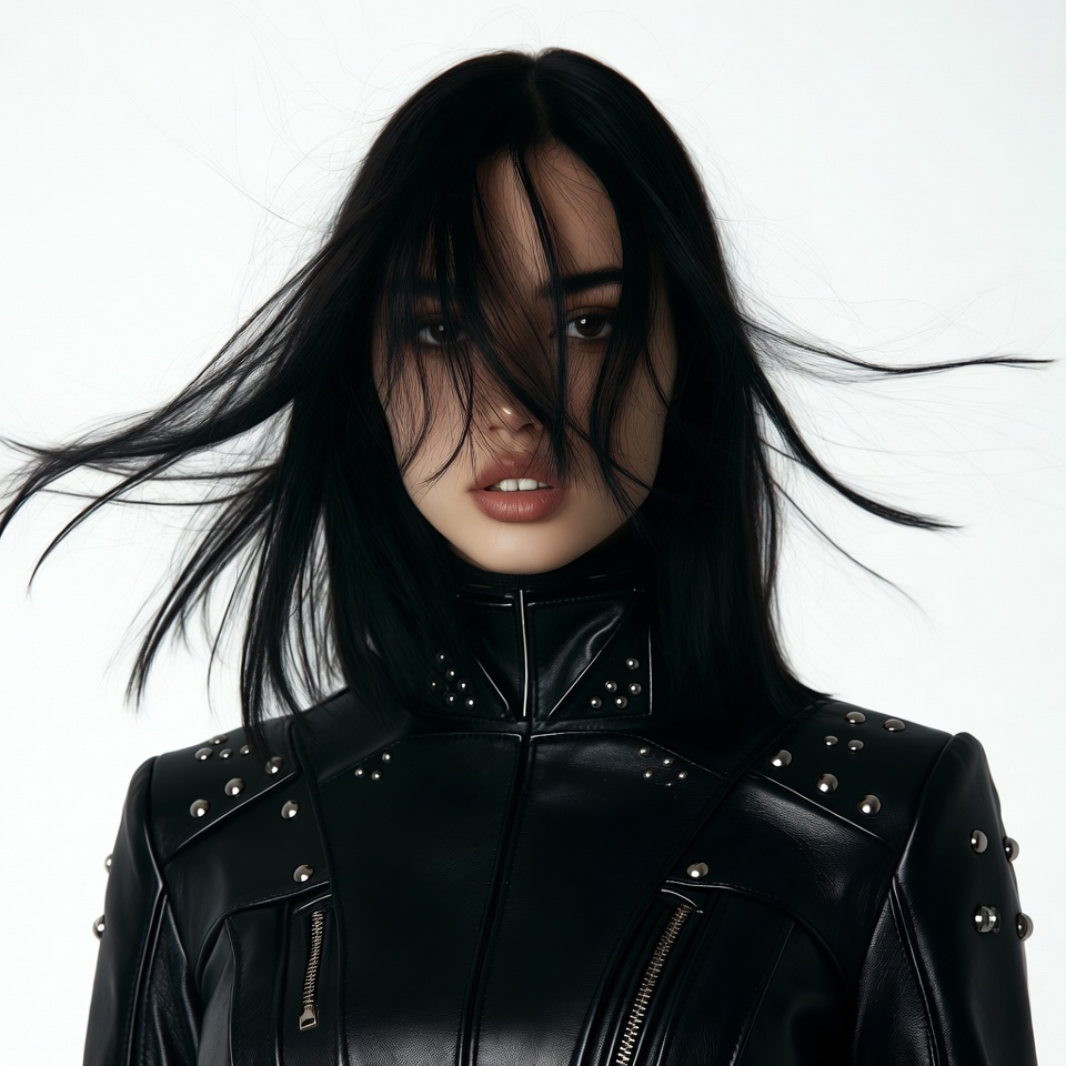 A young Asian woman with long black hair blowing across her face stands against a white background. She wears a shiny black leather jacket adorned with silver studs and zippers. Her expression is intense with subtle makeup and pink lips.