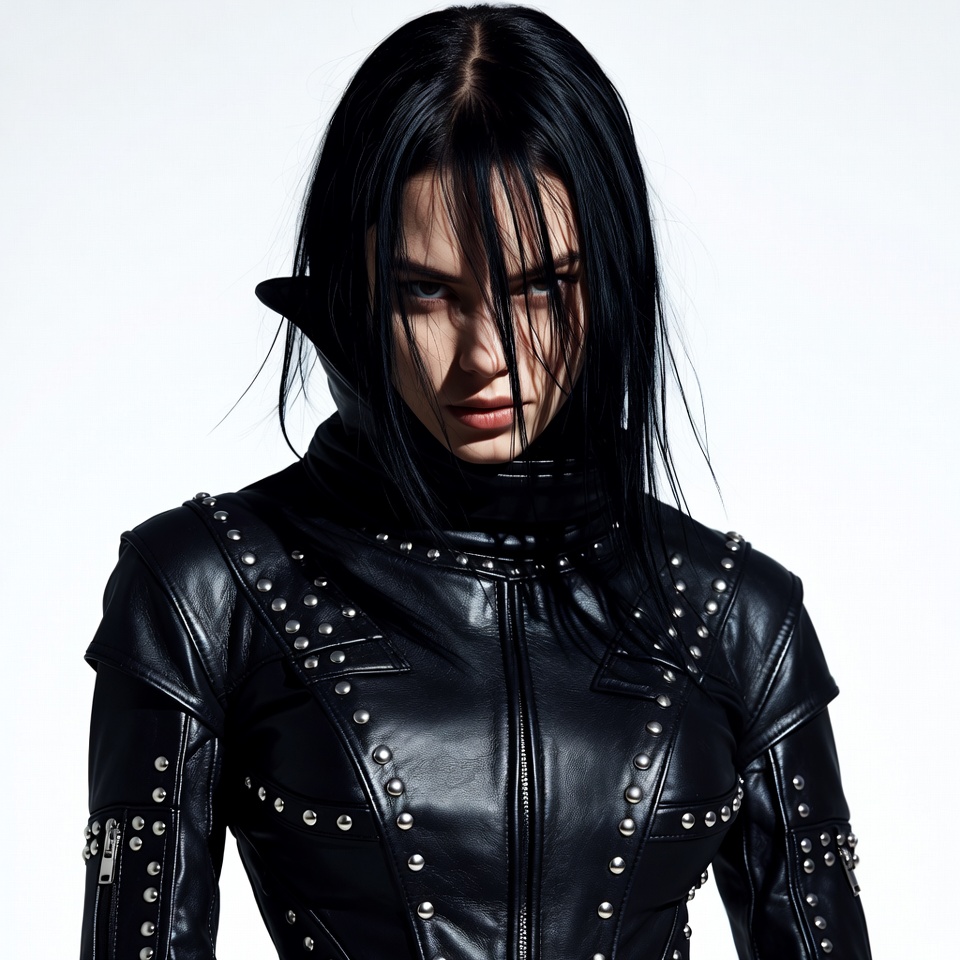 White, biker jacket, black hair, black leather, close-up, dark clothing, edgy style, fashion, female, fierce expression, glossy leather, high collar, intense gaze, leather jacket, long hair, metal studs, portrait, shoulder pads, silver studs, studded jacket, stylish outfit, white background, young woman, zipped jacket, woman
