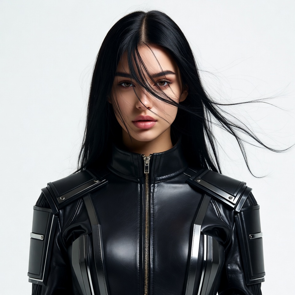 Asian, armor jacket, black clothing, black hair, blowing hair, close-up portrait, cyberpunk fashion, dark eyes, female, futuristic jacket, high collar, intense gaze, leather jacket, long hair, metallic accents, portrait, serious expression, shiny leather, shoulder guards, stylish outfit, white background, young woman, zipper jacket, woman