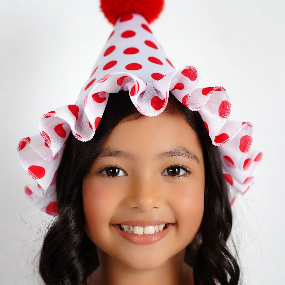 A young Asian girl with long dark curly hair smiles happily at the camera. She wears a festive white party hat with red polka dots and a red pom-pom on top. The hat has ruffled red and white edges, and she is centered against a plain white background.