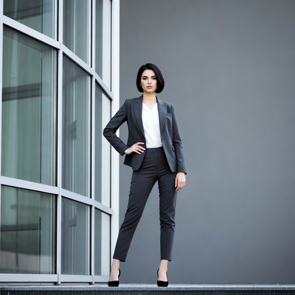 A woman with short dark hair stands confidently in a gray pantsuit and white blouse next to a modern glass building. She poses with hands on hips, wearing black high heels on a concrete platform. The background features large reflective glass panels and a gray wall.