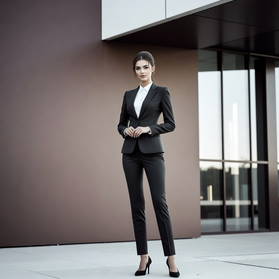 architecture, black suit, brown wall, business suit, businesswoman, city building, confident pose, corporate fashion, dark hair, formal wear, glass facade, high heels, modern building, office attire, pantsuit, professional woman, standing pose, stylish woman, urban background, white shirt, young woman, woman