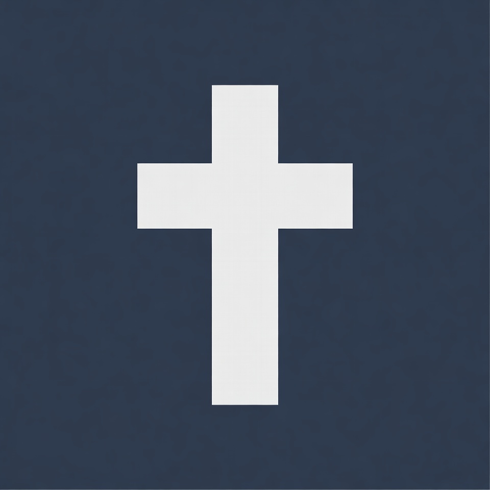 A simple white Christian cross is centered on a solid navy blue background. The cross features clean, bold lines with equal horizontal and vertical arms. It stands out prominently against the dark backdrop.