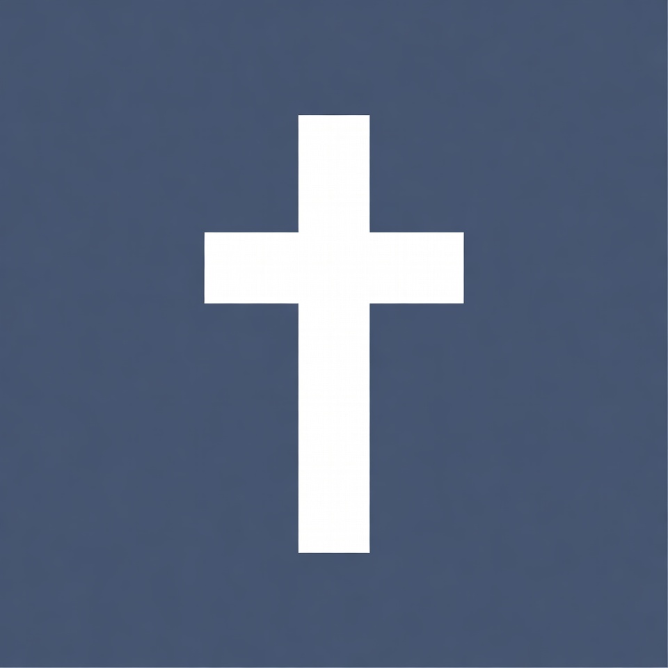 A simple white Christian cross is centered on a solid navy blue background. The cross features clean, bold lines with equal horizontal and vertical arms. It stands out sharply against the dark backdrop.