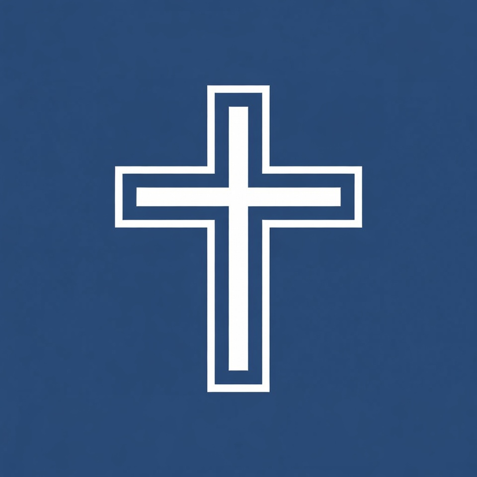 A simple white Christian cross with a double outline is centered on a solid navy blue background. The design is clean and minimalist with bold lines. It appears to be a vector graphic or clipart illustration.