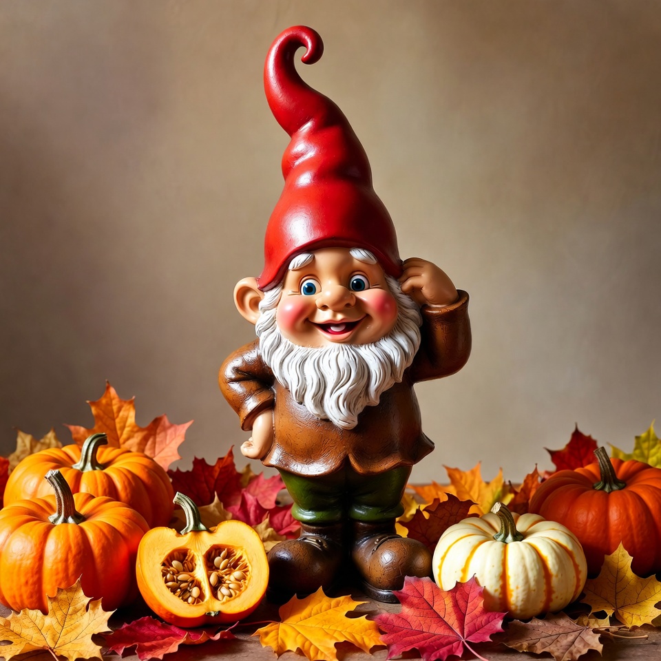 A cheerful garden gnome statue with a red pointed hat, white beard, and brown outfit stands surrounded by orange pumpkins and scattered autumn leaves. One pumpkin is sliced open revealing its seeds. The gnome has a playful expression with one hand to its cheek on a neutral background.