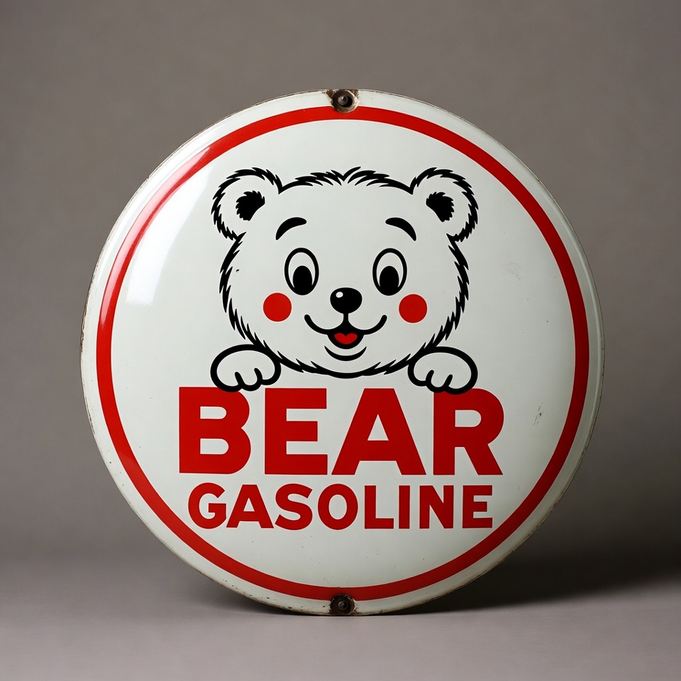 advertising sign, bear, bear gasoline, cartoon bear, circular sign, collectible sign, fuel sign, gas station sign, gasoline sign, isolated background, porcelain sign, red border, retro sign, smiling bear, white bear, vintage sign