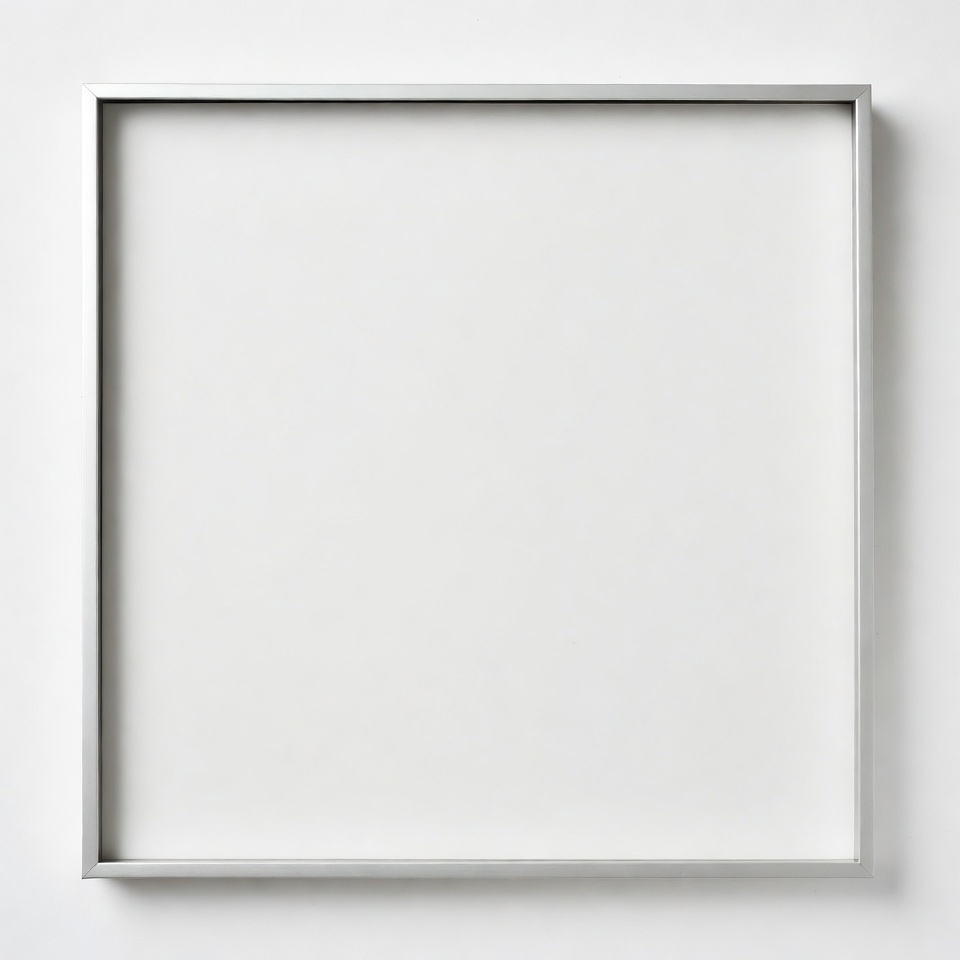 A square silver picture frame with a thin metal border stands against a plain white background. The frame encloses a completely empty white space. It is centered and isolated for clear visibility.