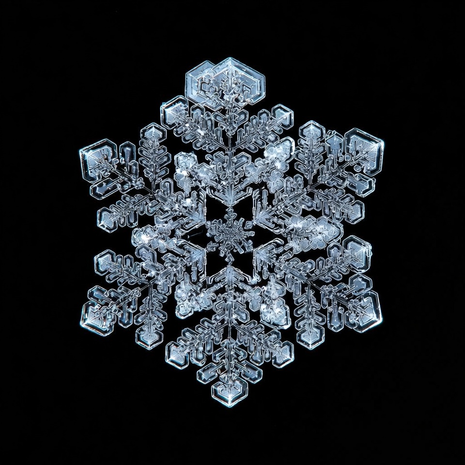 A close-up view of an intricate snowflake crystal with symmetrical branches and delicate ice structures. It is centered against a solid black background, highlighting its transparent and crystalline features.