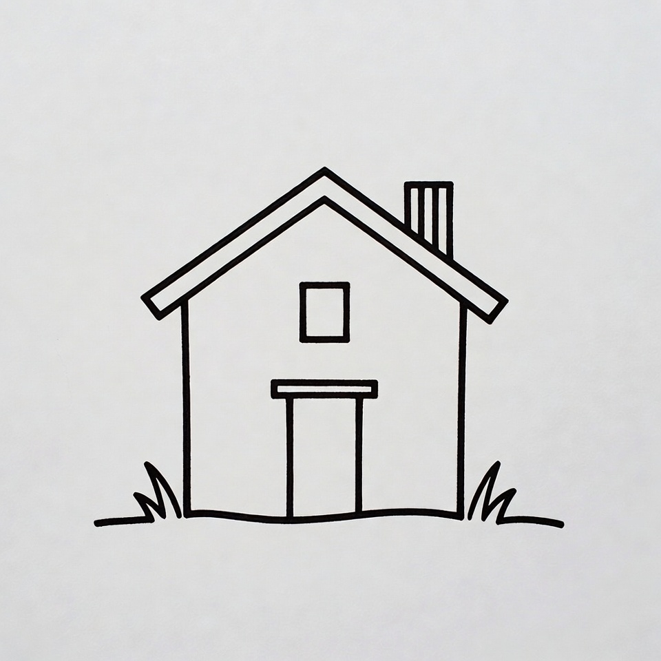 A black line drawing of a simple house features a gabled roof with a chimney, a single square window, and a front door. Short grass is sketched at the base. The illustration is on a plain white background.