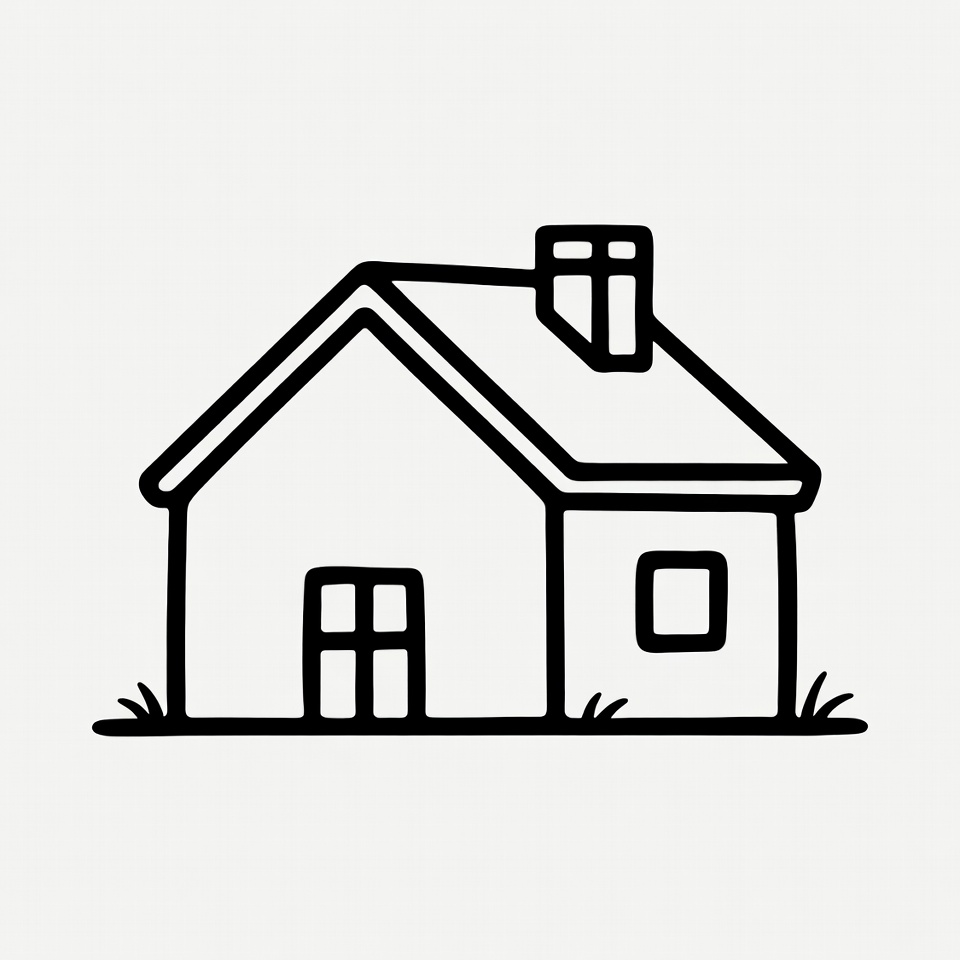 A black line drawing of a simple house with a sloped roof and chimney. It features a front door with two windows and a side window, surrounded by small grass tufts. The illustration is on a white isolated background.