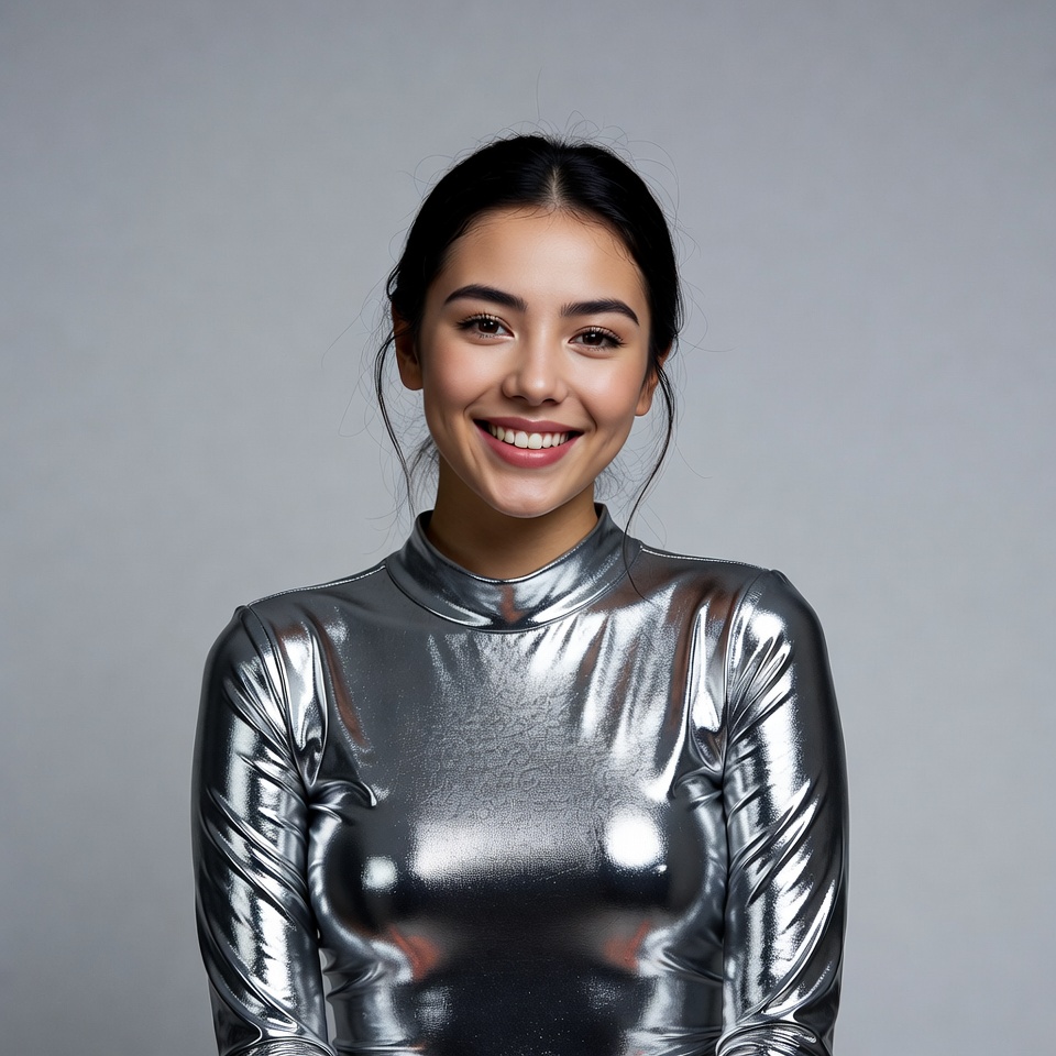 A young Asian woman with dark hair tied back smiles warmly at the camera. She wears a form-fitting silver metallic top with a high collar and long sleeves. She stands against a plain gray background.