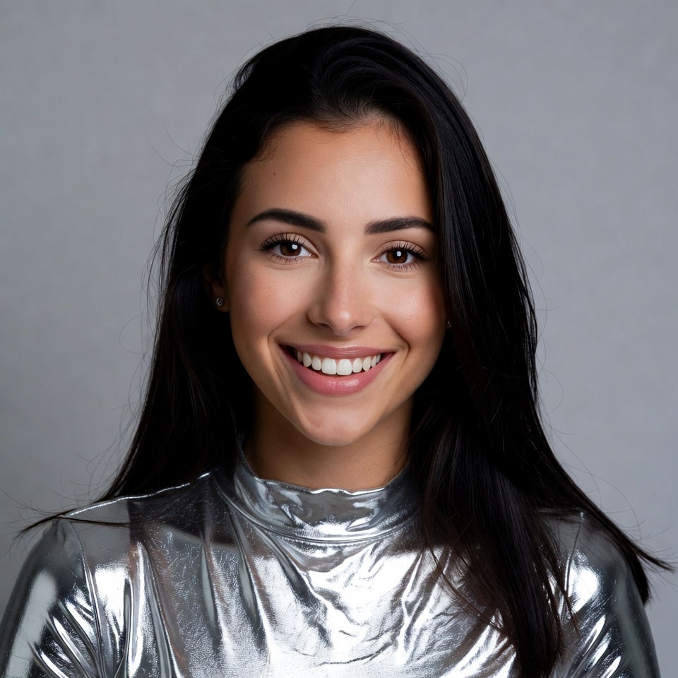 A young woman with long dark hair smiles warmly at the camera against a plain gray background. She wears a shiny silver mock-neck top that reflects light. Her brown eyes and bright smile are prominently featured in the close-up portrait.