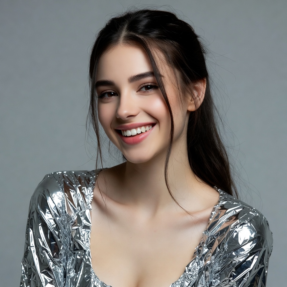 A young woman with long dark hair styled in a ponytail smiles warmly at the camera. She wears a shiny silver metallic dress with a low neckline. The image features a plain gray background.