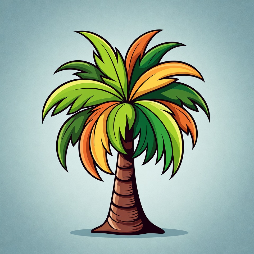 A vibrant cartoon illustration of a palm tree with green, orange, and yellow fronds on a light blue background. The trunk is brown and slightly curved at the base. The image features bold outlines and a playful, isolated design.