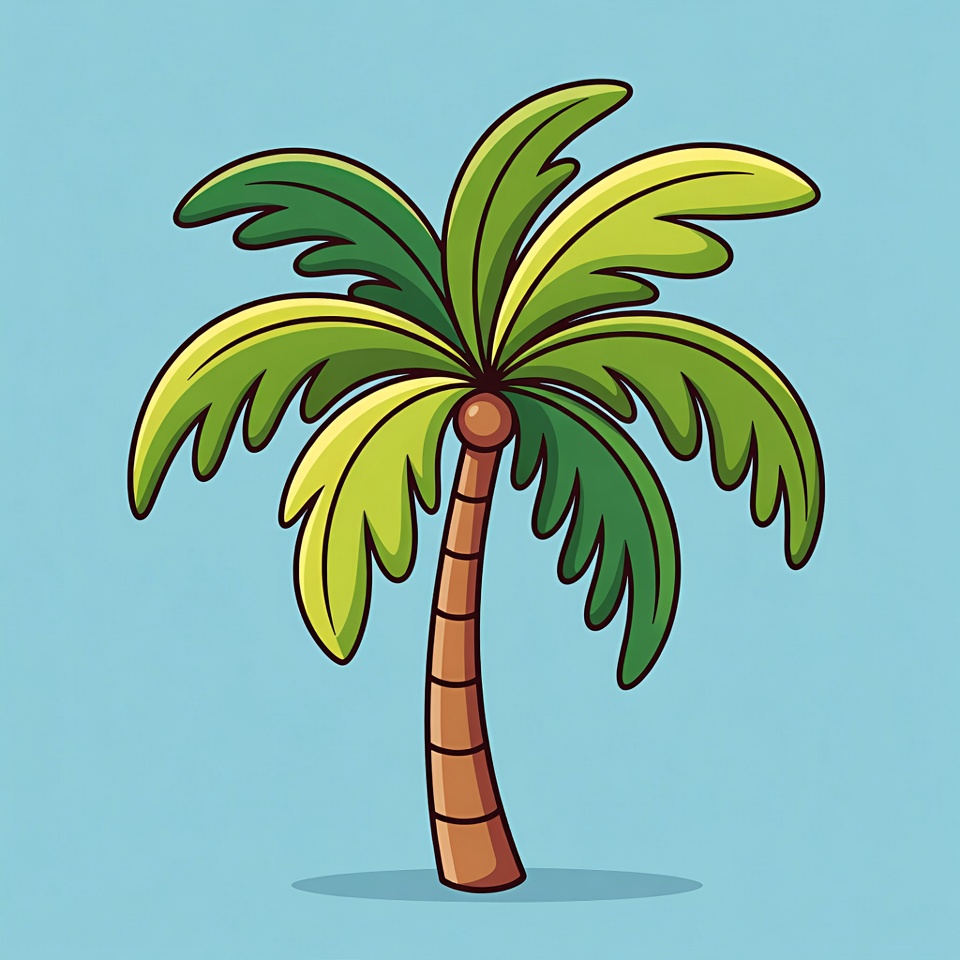 A vibrant cartoon illustration of a palm tree with green fronds and a brown trunk stands on a solid blue background. The leaves are detailed with smooth curves and highlights. A subtle shadow appears beneath the tree.